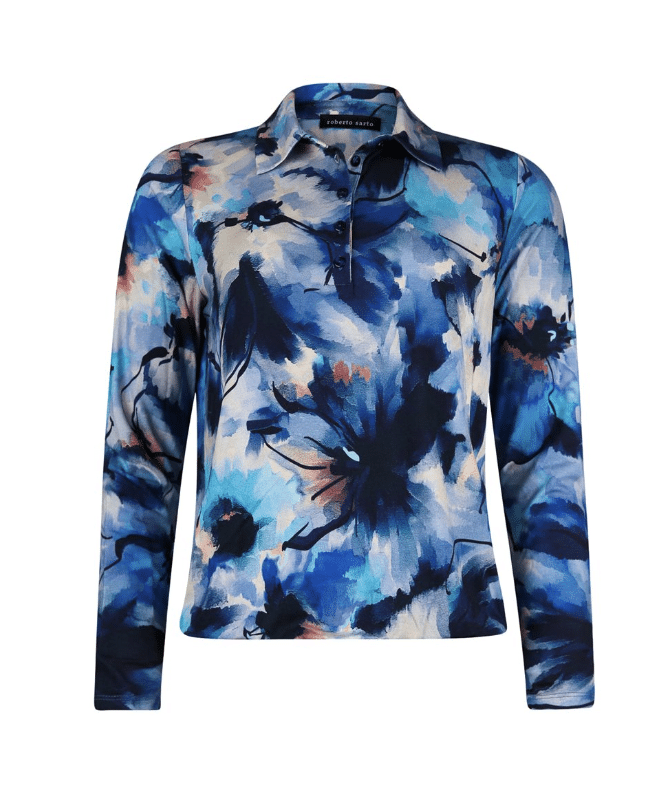 Poloshirt met een hoogesloten kraag in prachtige print in een mooie zware viscose kwaliteit van het merk Roberto Sarto. Dit model heeft een lange mouw lengte en is perfect te combineren met alle tinten dit najaar.