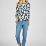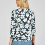 Bewerkt shirt met mooie allover bloemen print. Perfect te combineren met de groene en blauwe vesten en andere items uit de nieuwste serie van Rabe dit voorjaar. Mooie sportieve halslijn met band en fijne details van het merk Rabe. Dit shirt heeft een 3/4 mouw lengte, mooie zachte kwaliteit en kleurstelling groen en blauw.