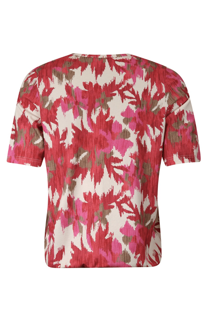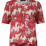 Shirt met een de nieuwste allover print in de een prachtige kleuren combinatie rood en roze van Roberto Sarto. Dit shirt heeft een elastiek aan de onderzijde (blouson model), gesmokte halslijn en met een kort mouwtje tot op de elleboog. Pasvorm is royaal.
