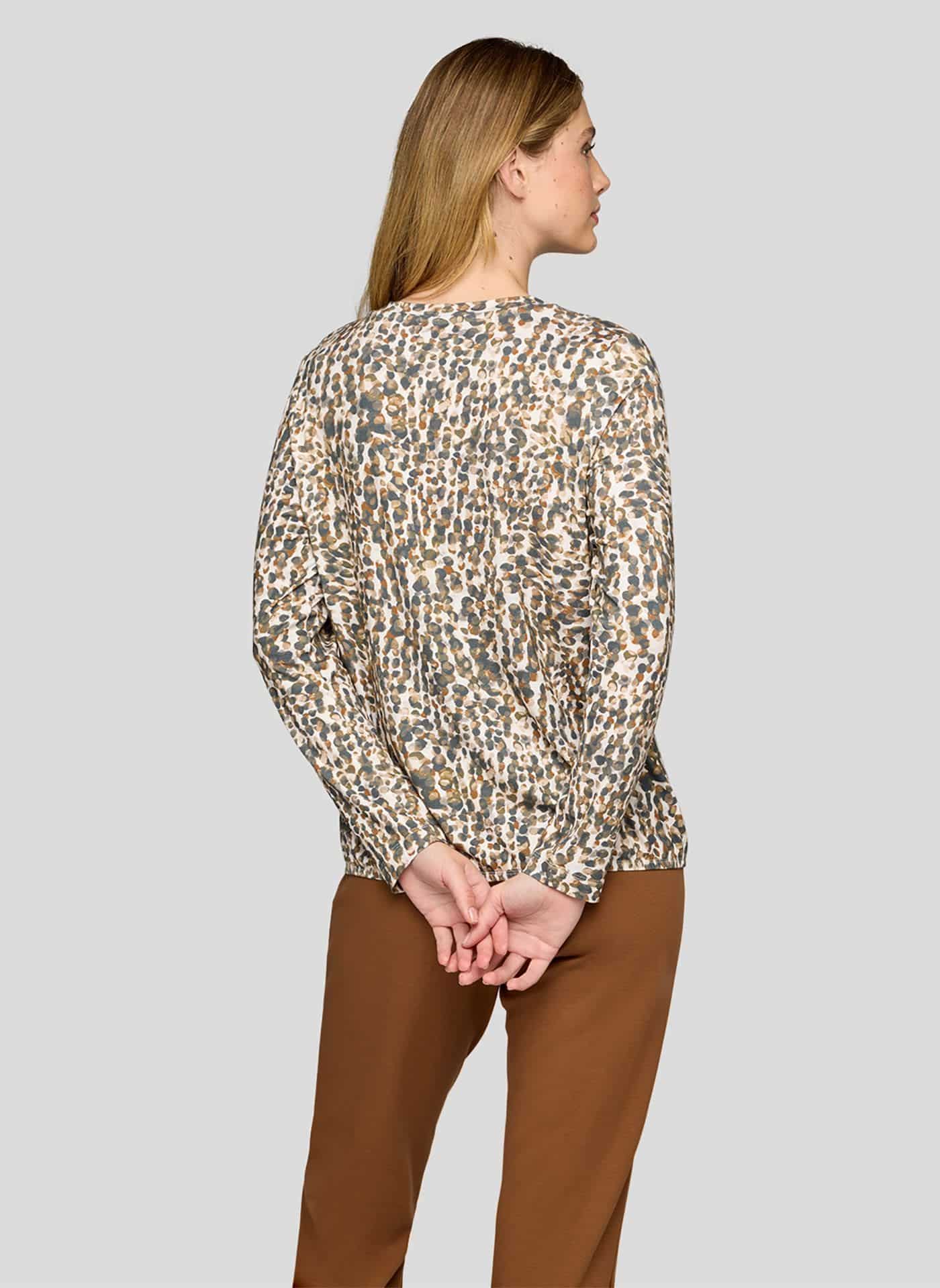 Bewerkt shirt met mooie luxe allover print in een mooie herfst kleurstelling. Perfect te combineren met vele leuke vesten en andere items uit de nieuwste serie van Rabe deze herfst en winter. Mooie sportieve halslijn en fijne luxe details van het merk Rabe. Dit shirt heeft een 3/4 mouw lengte, mooie zachte kwaliteit en kleurstelling taupe/bruin.