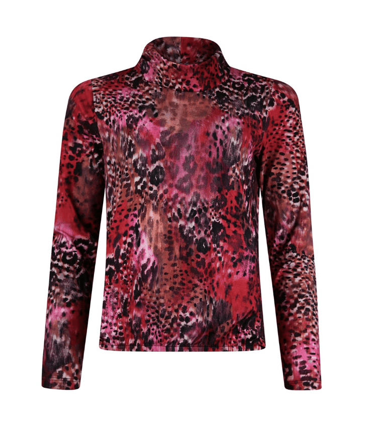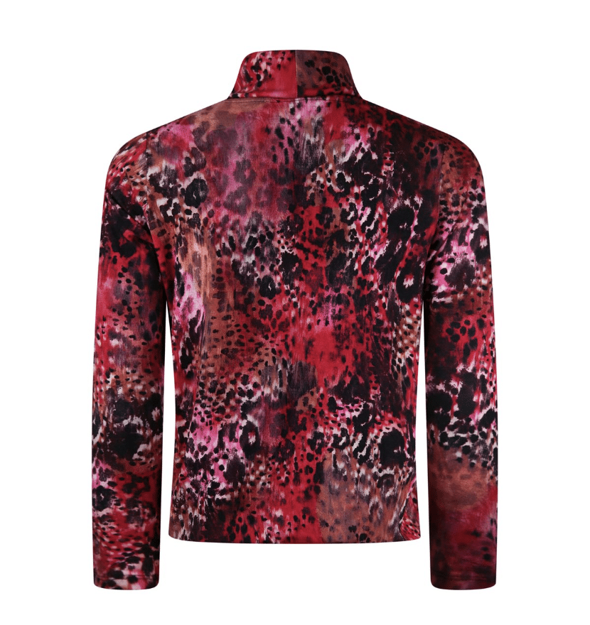 Blouson model shirt met kleine colkraag en een luxe unieke Sarto print in een mooie zware viscose kwaliteit. Elastiek aan de onderzijde en een lange mouw lengte. kleurstelling cerise en zwart