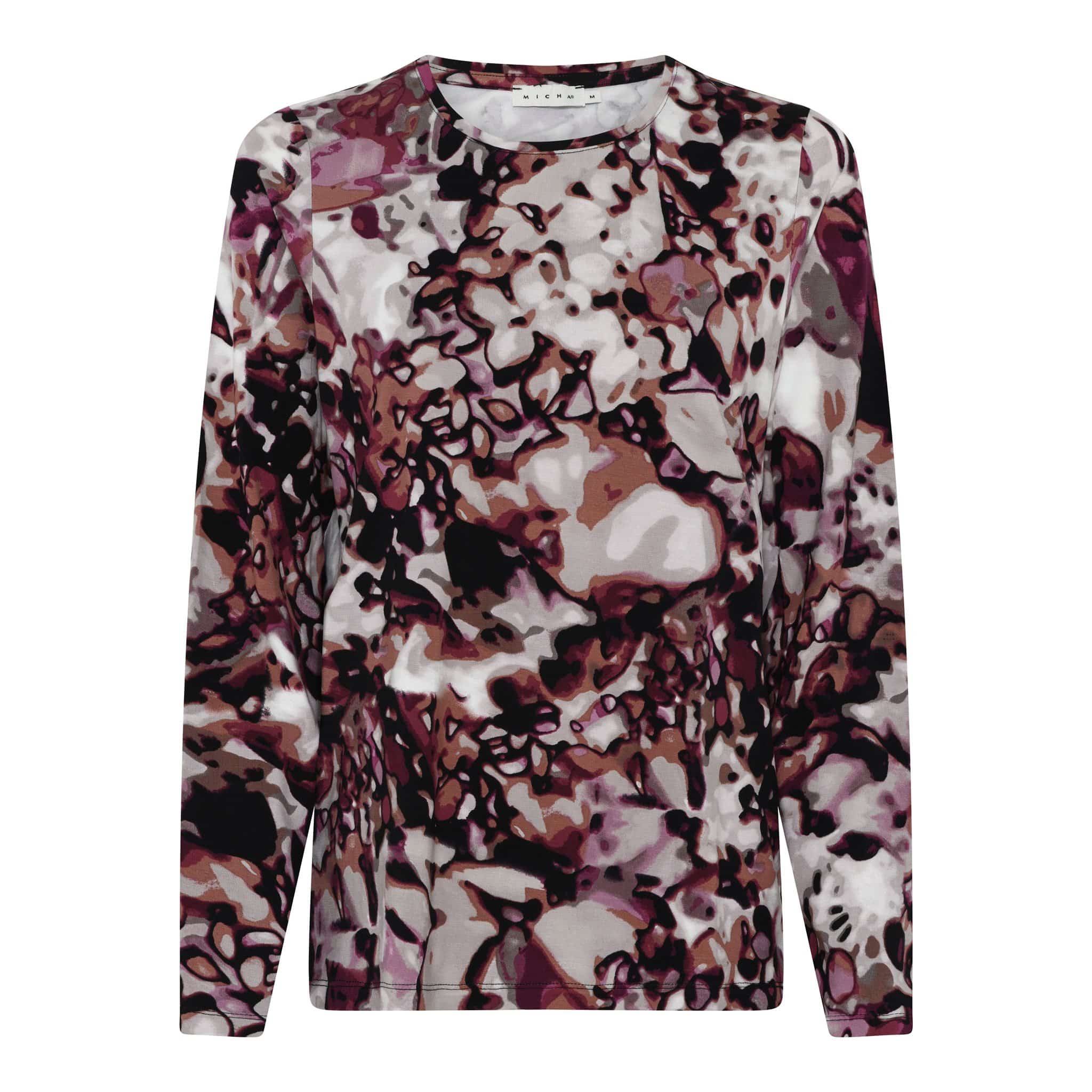 Bewerkt shirt met een warme allover print in een zuiver viscose kwaliteit van het merk Micha. lange mouw lengte, mooie hals lijn in de kleurstelling paars. Perfect met een bijpassend rits vest in de dezelfde kleur.