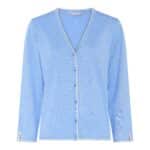 Prachtige vest met Vhals afgezet met zandkleuring biesje van Micha. Het vest is luxe uitgewerkt met parelknoopjes en er is in dezelfde kleurstelling een truitje te bestellen om een mooi twinset te stylen.