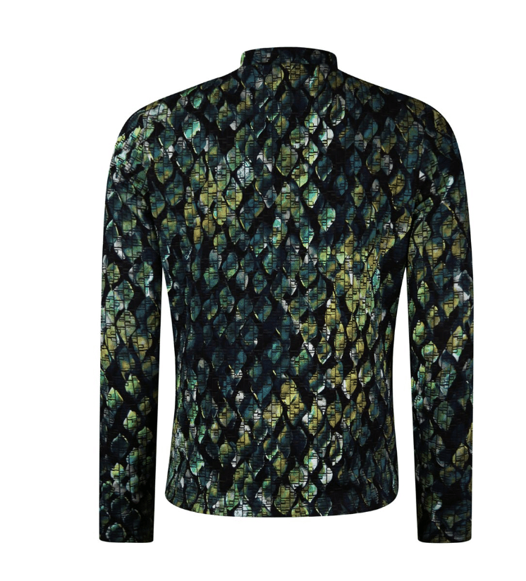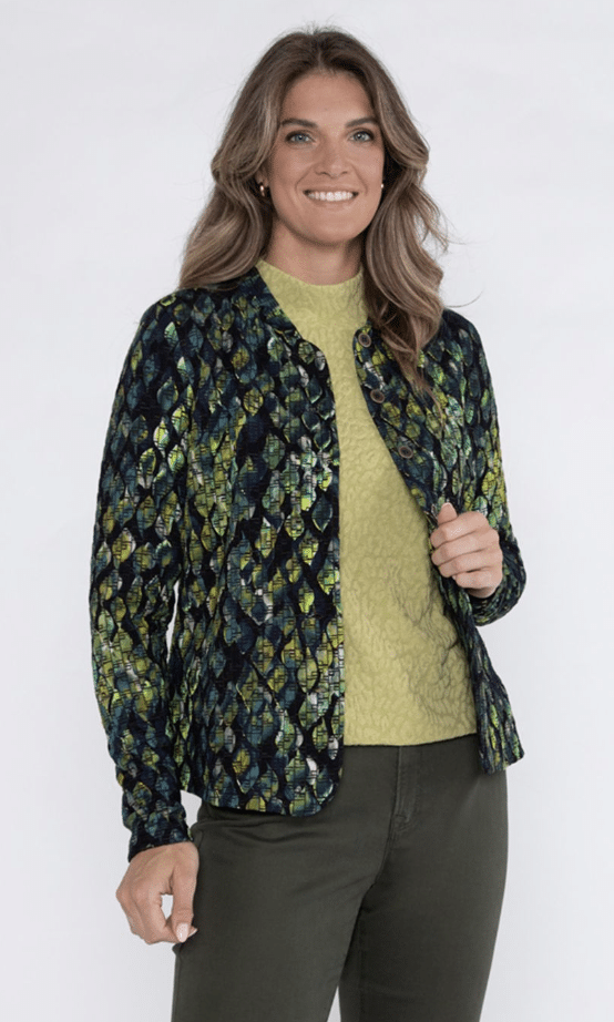 De musthave voor dit najaar, prachtig ongevoerd jasje/vest met grote knopen en allover print, mooie subtiele print exclusief van Roberto Sarto. Kleurstelling met verschillende tinten groen en marine blauw (multicolor). chanel model en lange mouw lengte.
