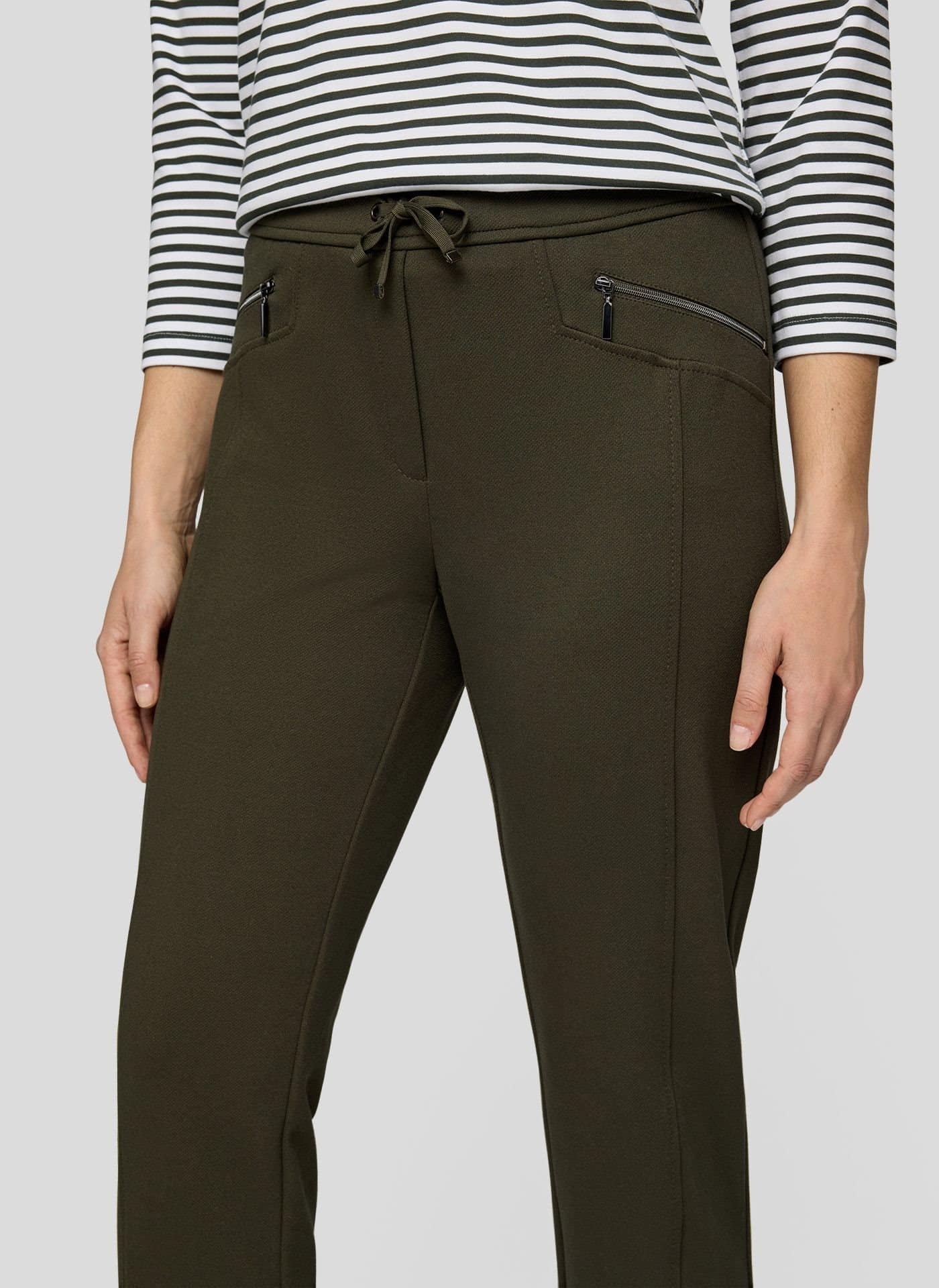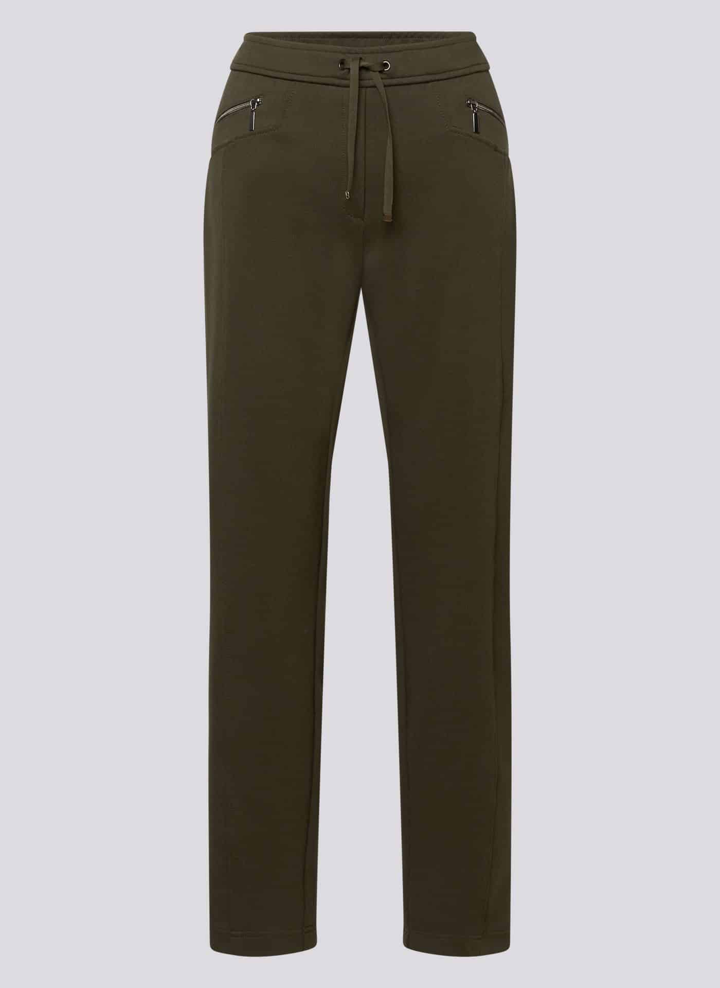 Mooie tricot (zware viscose) pantalon van het merk Rabe. Elastiek rondom met een namaakgulp en sportief look middels het zakje en koortje aan de voorzijde en een soepele elastieke band rondom. Dit model zit bijna alle dames goed!